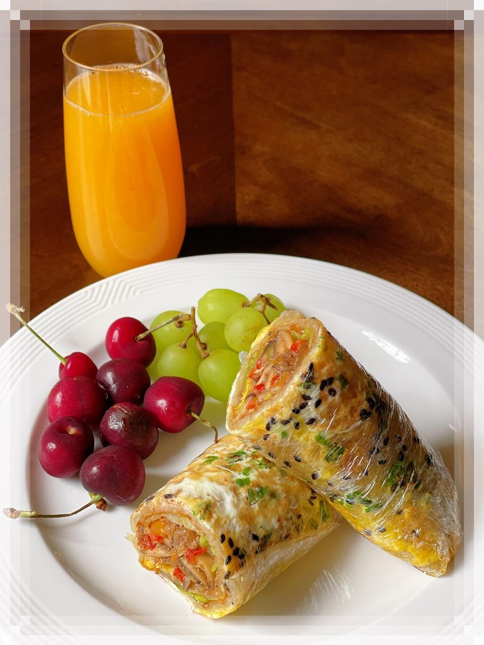 🔺第123道→ 葱油蛋饼煎香肠 热锅少油,放入市售冷冻葱油饼一张,底部断生后翻面,打上一颗鸡蛋撒黑芝麻,两面煎熟,切块。 香肠一根对半切,再纵向切几刀,放入锅里煎熟。同时可放入一把小叶菠菜,加一点鸡汤翻炒至熟。 半个柠檬🍋+两个橘子🍊榨汁。 燕麦奶一杯。