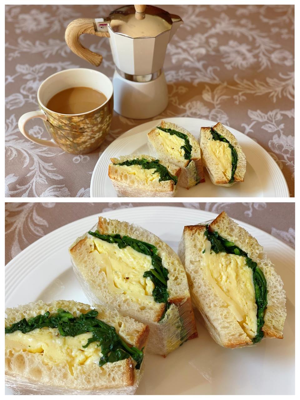 🔺第139道→ 炒蛋菠菜芝士三明治🥪 鸡蛋×2 加少许牛奶或高汤及盐打散成蛋液,热锅热油倒入蛋液,见略凝固时轻轻拨动,形成松软大片的炒蛋。 热锅黄油融化,放入适量菠菜,加盐/黑胡椒调味,翻炒至熟。 面包片×2 各涂一层薄薄的蛋黄酱,一片面包上先铺菠菜再铺炒蛋再放芝士片,盖上另一片面包,保鲜膜裹紧,切开。 ⭐️ 菠菜炒后也容易出水,保鲜膜势必裹紧,尤其是准备带着外出的时候。