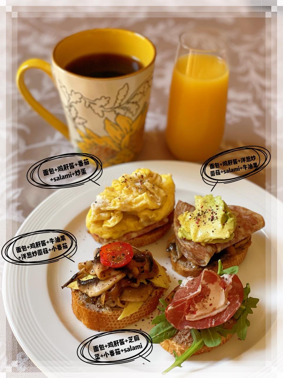 🔺第110道→ 拼拼凑凑又一盘 法棍切片烤热。 洋葱炒蘑菇→洋葱切丝,蘑菇切片。热锅黄油,先炒香洋葱再放蘑菇翻炒均匀,加盐/黑胡椒/干香料调味。 小番茄对切或切片。 鸡蛋1颗加盐打散炒至凝固。 牛油果切片或直接勺子挖出。 市售鸡肝酱或其他涂抹酱,市售salami或火腿片或培根煎熟。 芝麻菜或任意可生食蔬菜。 充分利用现有食材,根据自己喜好,可以做出很多组合搭配。