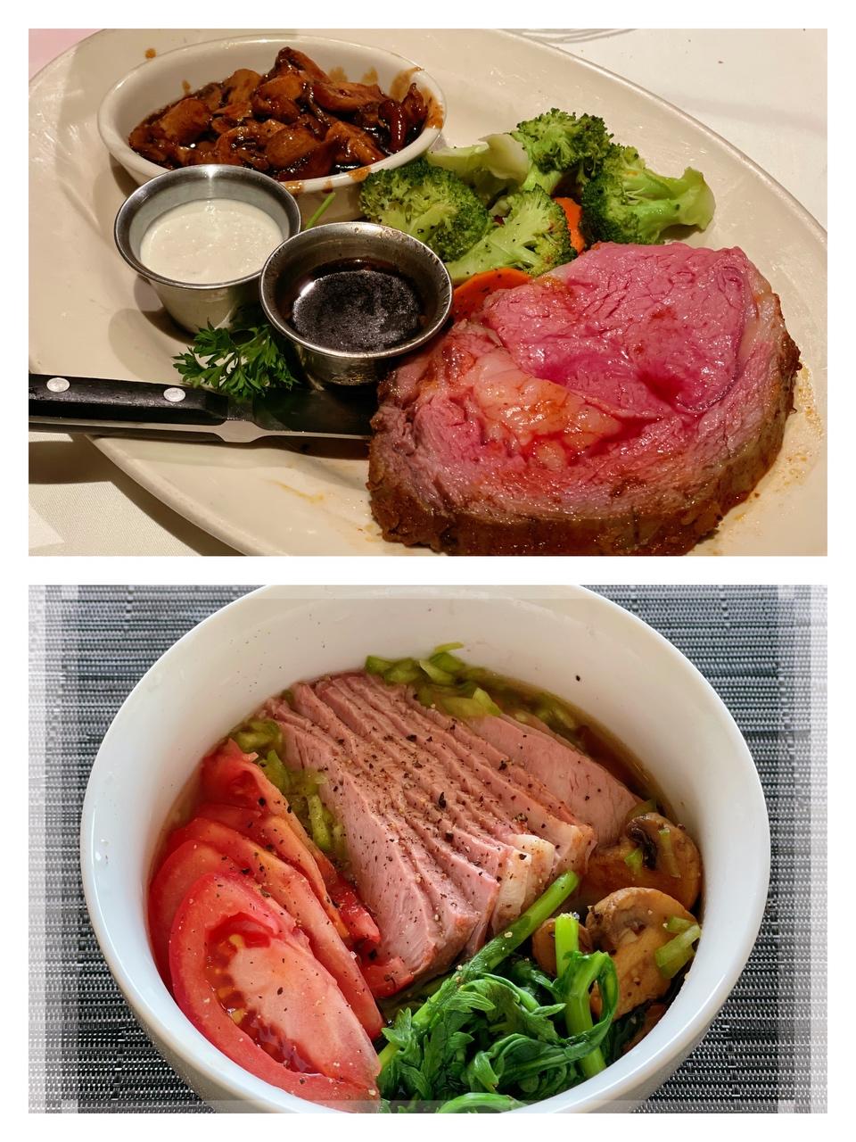 🔺第115道→ 嫩牛蘑菇面 昨晚去吃Prime Rib剩了半块肉,还有配菜蘑菇(有点咸)。 早上煮了碗面,烫了把茼蒿,切了1/4个番茄,剩的牛排切薄片,蘑菇加点水略炒一下,跟以上所有食材都铺在面上,倒入煮面水,撒黑胡椒。 本来还想打颗蛋,还好没有,实在够大碗。