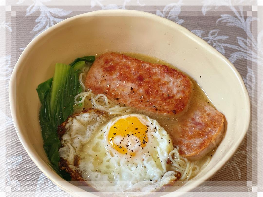 🔺 第141道→ 港式茶餐厅餐蛋面🍜 热锅薄油,午餐肉2片煎至两面金黄,再来一颗鸡蛋单面煎。 汤锅中滚水,放入方便面及调味包煮熟捞出,一颗青菜放入汤锅里烫熟,铺在面上,午餐肉和煎蛋也铺在面上,倒入煮面汤,撒黑胡椒。