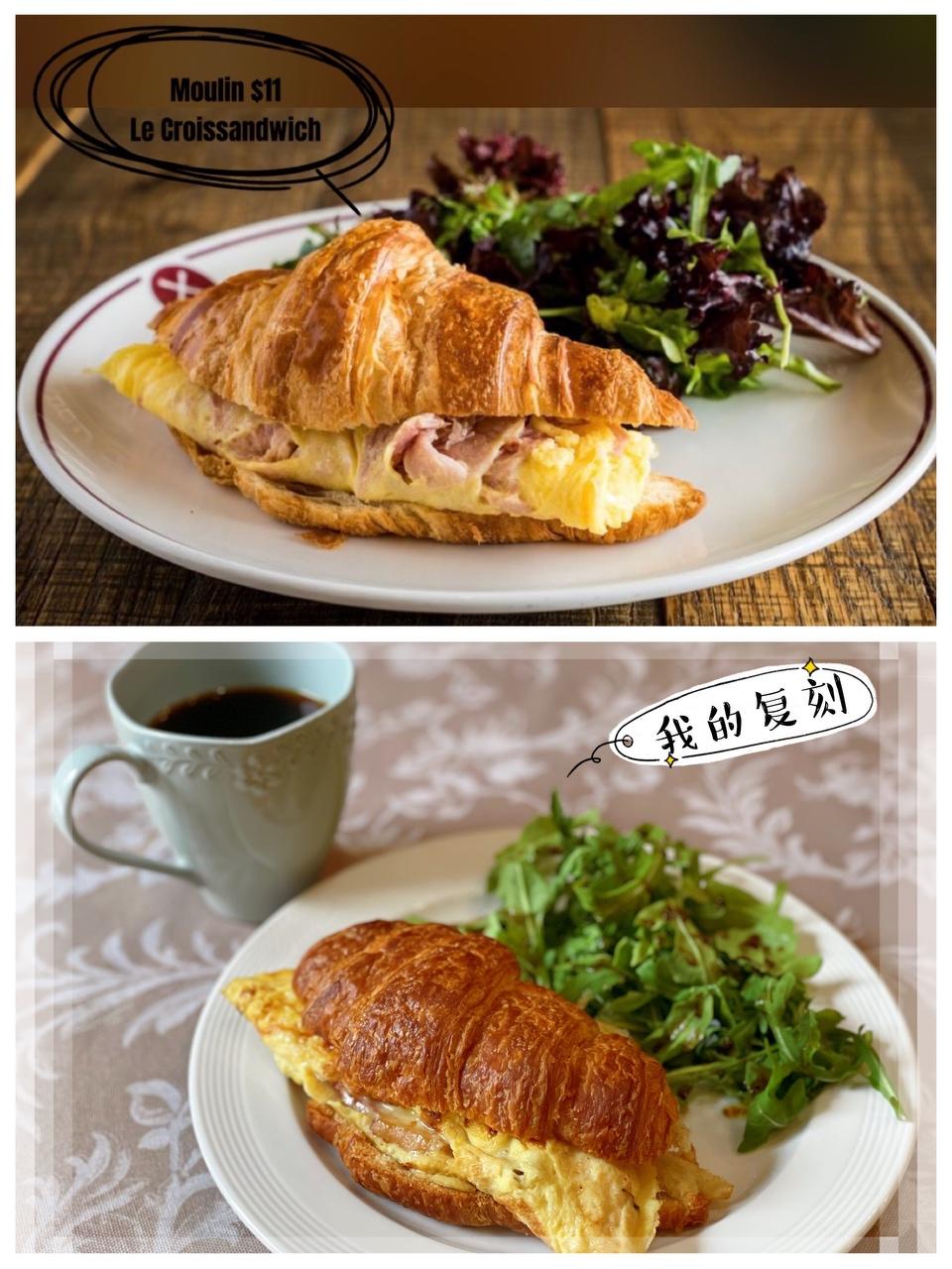 🔺第148道→ 火腿培根芝士蛋三明治 家附近有一家法国早餐店,不等位坐不下的那种,可见喜欢去他家的人有多少。好几年前去过一次,但对于当时吃了什么没留下什么印象,官网上翻了一下他们的餐牌,相比美式传统早餐是健康得多,没那么多甜腻。 挑了一个可颂三明治来复刻。 可颂面包🥐烤热从中间剖开,上下两片。 鸡蛋2个打散成蛋液。 热锅薄油中火,放入2片培根煎至微焦,放入火腿两面略煎,把培根放在火腿上,再放一片芝士片,拨到锅边。倒入蛋液,轻轻掀起火腿让蛋液流到下层铺满锅底。静置一会儿见蛋液基本凝固,对折后再烘一下使内层蛋液熟成,及芝士片融化。然后整个放在可颂面包的下层,再盖上上层。 旁边搭配蔬菜沙拉。 ⭐️ 餐厅用的薄火腿片,我用的厚火腿片。食材方面根据自家现有情况调节。
