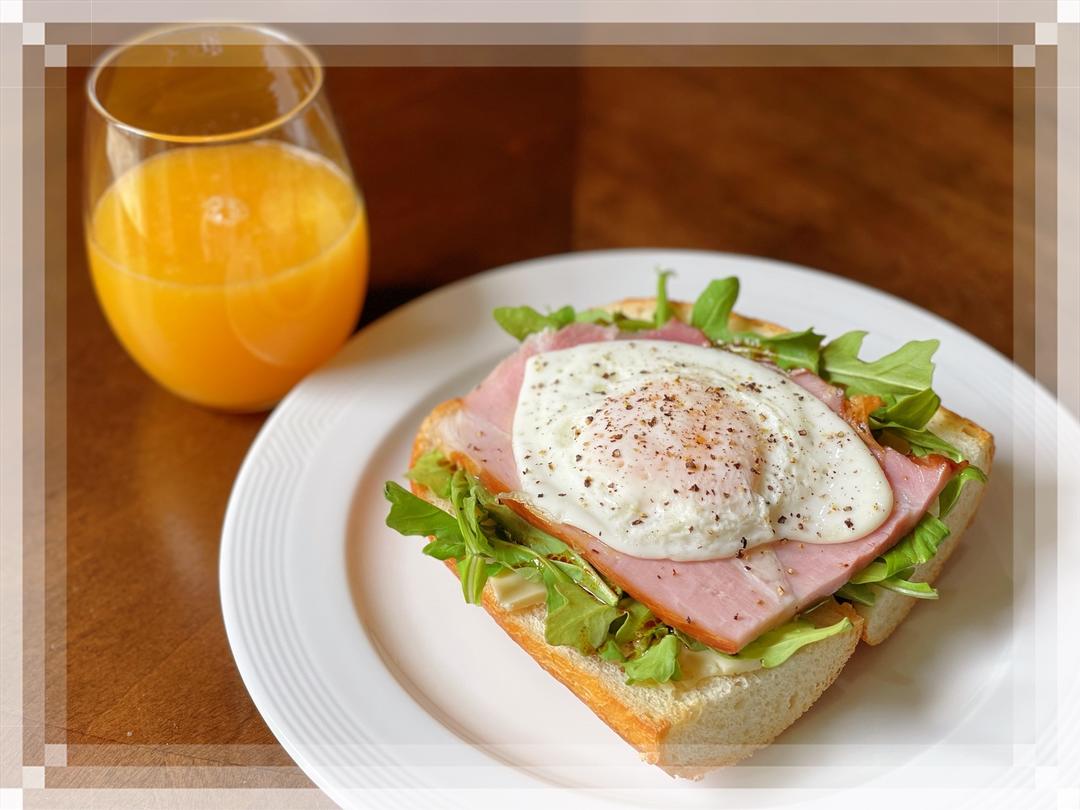 🔺第107道→ 火腿蛋三明治 法棍对切烤热+软奶酪切片+芝麻菜淋油醋汁+煎蛋,撒黑胡椒。 柠檬🍋半个+橘子🍊2个榨汁。