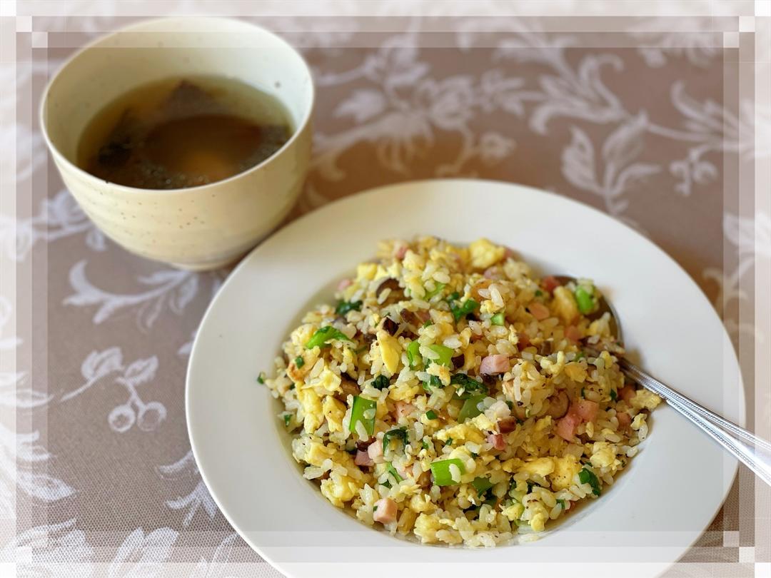 🔺第126道→ 香菇火腿蛋炒饭/排骨海带汤 米饭一碗,鸡蛋2颗,其中一颗蛋黄打入米饭中加盐搅拌均匀,另一颗整蛋+蛋白加盐打散成蛋液。 香菇切丁,火腿切丁,小青菜切段。 热锅热油,倒入蛋液不断搅散成小丁碎碎的,盛出备用。 热锅热油,依次放入香菇丁和青菜段炒至断生,倒入米饭,翻炒均匀,加盐/蚝油调味,再放入火腿丁和鸡蛋碎翻炒均匀,出锅前撒葱花略翻炒即可。(还可加少许辣油调味)