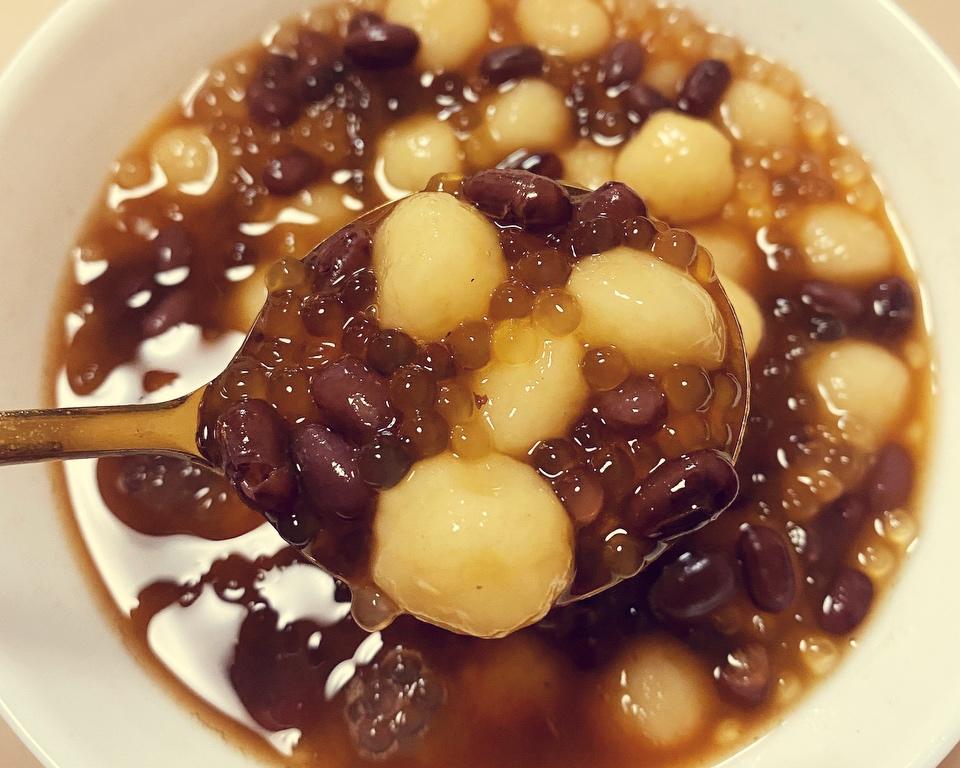 往盛出的红糖糯米团里加些煮好的西米和红豆就完成✅了。 剩下的放冰箱明天吃。
