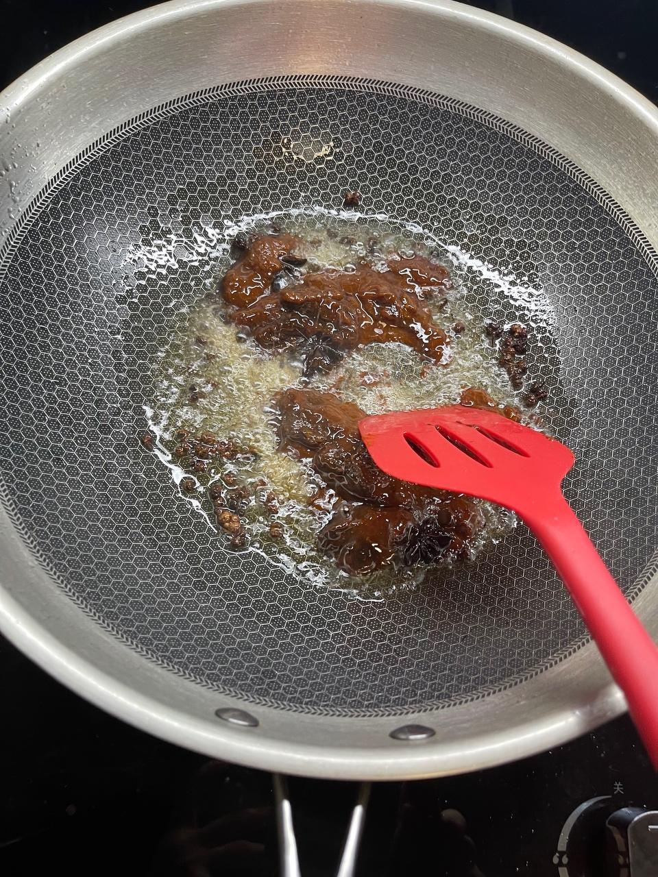 热锅凉油放入八角花椒炒香,不喜欢花椒的,可以炒香后把它拨出来