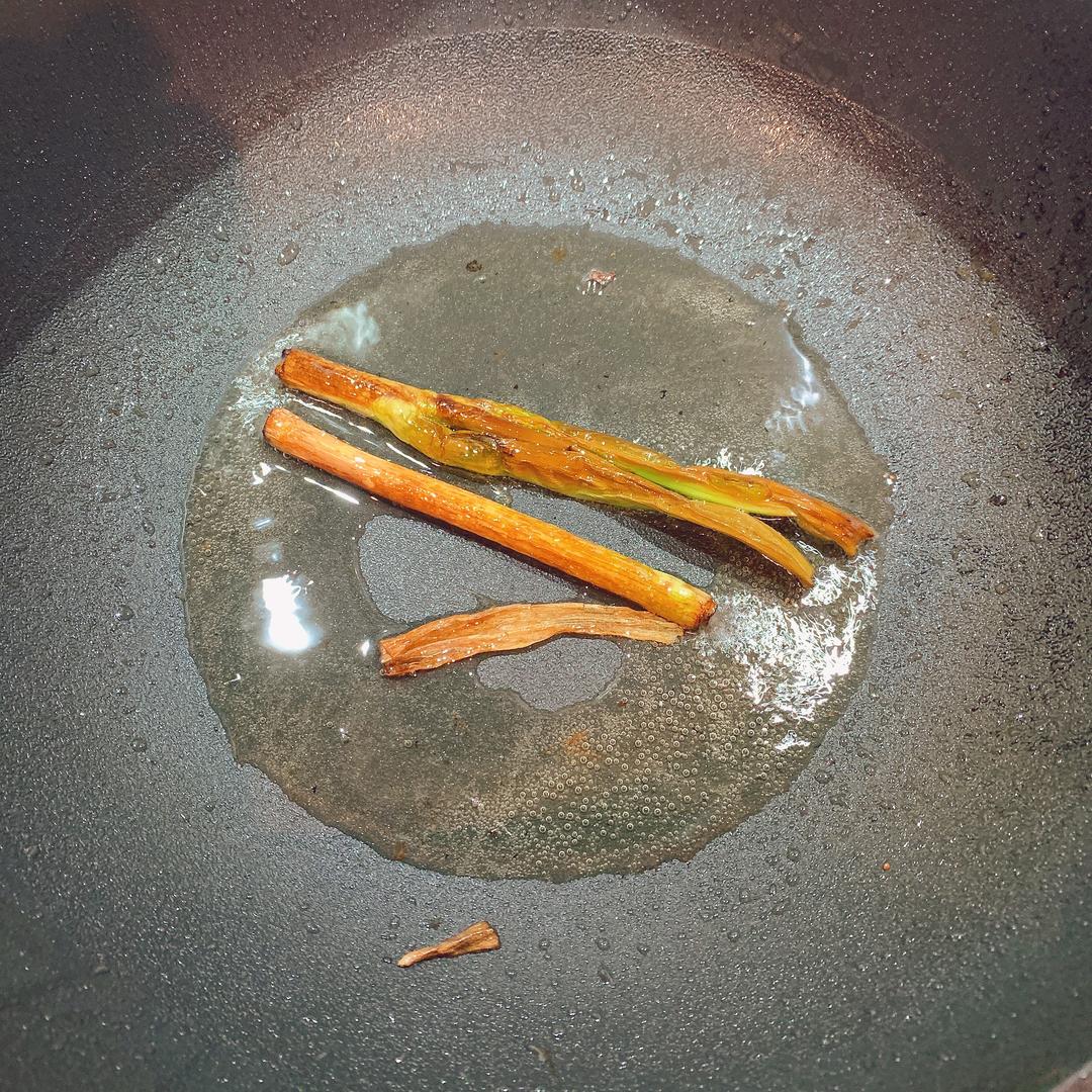 锅里放油,放入一根小葱炸葱油,喜欢味道浓郁点的可以多炸几根。