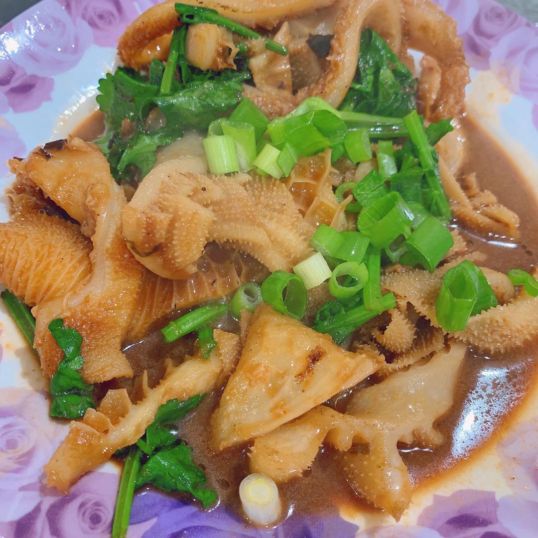 放入牛肚跟牛百叶。因为炒完以后缩水还蛮大的,所以我炒的量比较多。大家可以根据自己的需求增减。 牛肚跟牛百叶我是在亚超买的时候直接让他们切好了,因为我实在太懒了。所以比较大条,喜欢吃小一点的可以自己回来再改刀切小块一点。