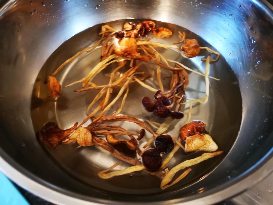 提前泡好的干蘑菇和黄花菜,口蘑切片