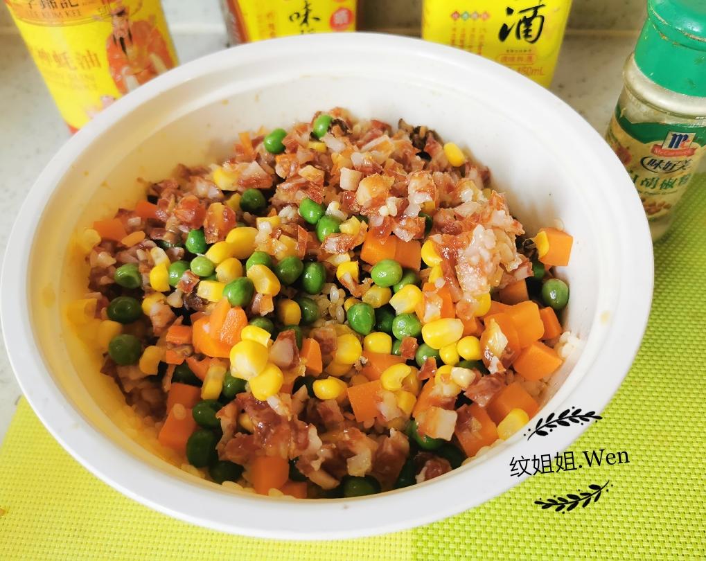 4、调好味的糯米和馅料(香肠粒、香菇粒、青豆、玉米、胡萝卜丁)拌均,腌制30分钟入味