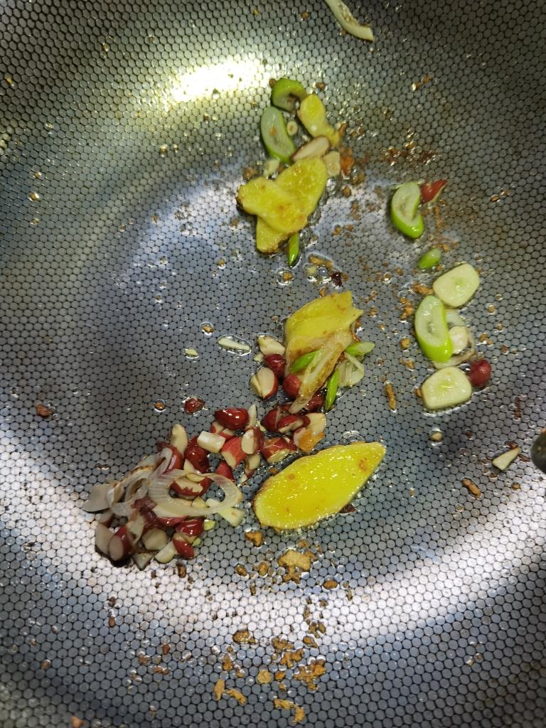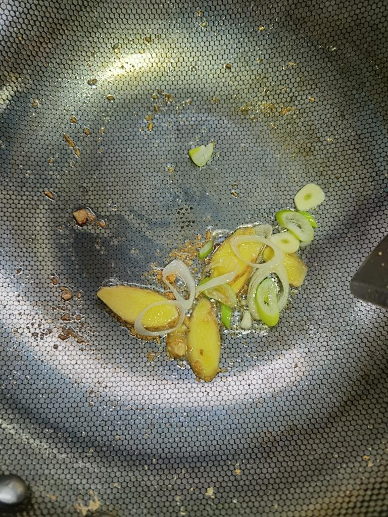 锅里的底油烧热,放生姜葱大火爆香。