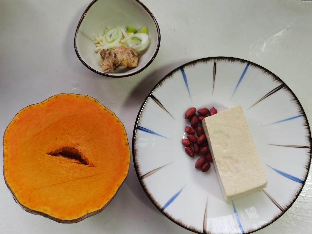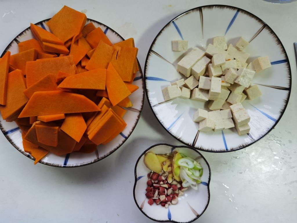 南瓜切薄片(无所谓形状,只要薄就行,反正后面都要煮化)。豆腐切丁。花生切碎。生姜切片。还有大蒜切末,香菜切碎(香菜可有可无)