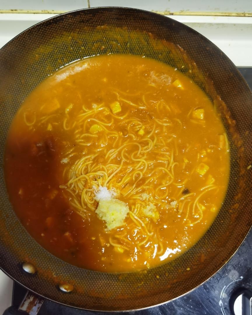 面条煮软后,加入蒜末、盐。搅拌均匀,关火。