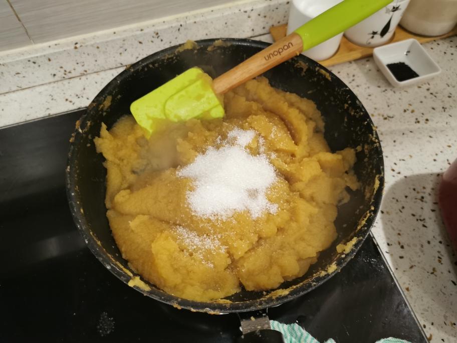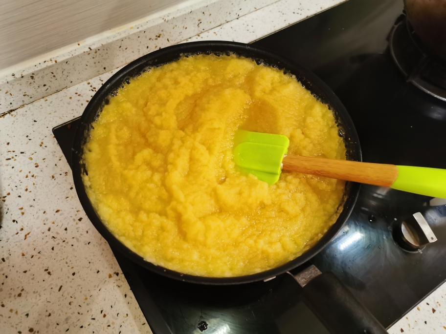 取不粘煎锅,倒入苹果泥,中小火熬煮至水分促渐减少。这个过程比较漫长 ,要有耐心,我用了差不多30分钟,铲子随时翻炒。水分会溅出锅外,可以盖个盖子。等水分干了就不会溅水了。(千万不要大火)