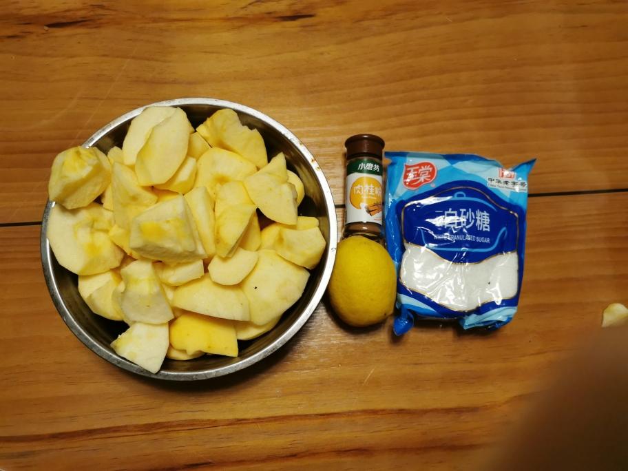 准备食材及配料,计量看用料明细。苹果去皮去中间硬核。