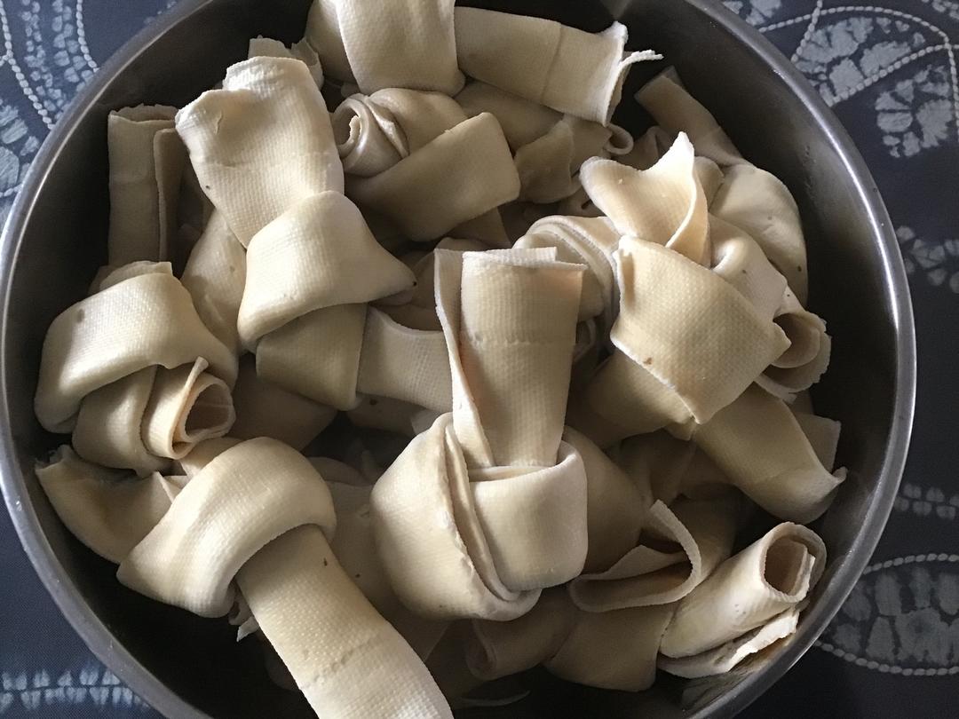 千张豆腐每一张沿着长边从中间切开,一分为二。从长边卷起来打结。一张千张两个结。因为是卷起来再打结,所以我们本地就叫豆腐卷,因为是卤味所以叫卤豆腐卷。