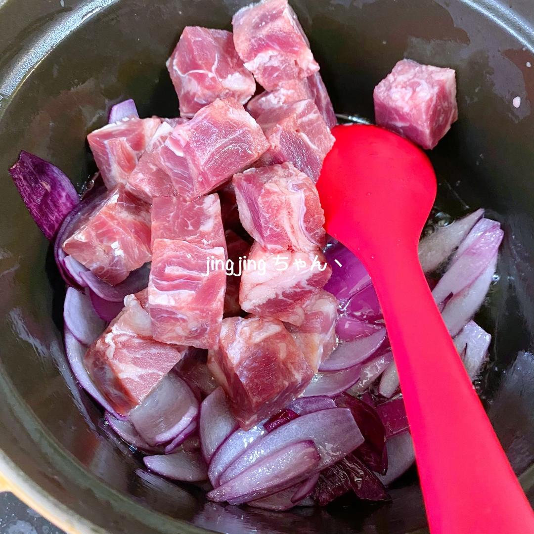 铸铁锅中加入葵花籽油,用中小火预热到位,再加入洋葱、南姜,炒香(这次做没有南姜,就没加); ⭐️如果要熬虾头油,那就铸铁锅中加入葵花籽油,用中小火预热到位,再转最小火,加入虾头耐心熬制香后,加入洋葱、南姜,炒香,然后把牛肉炒香,接着加入清水,沸腾后就把虾头捡出来丢掉,然后继续加其他调料调味即可;