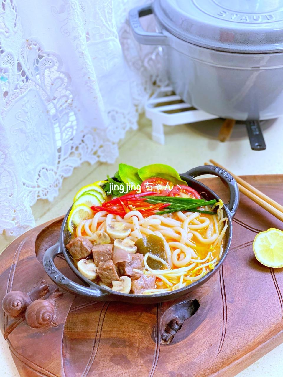 给铸铁锅中加入绿豆芽、做好的冬阴功牛肉汤,小火加热煮至沸腾(用小火是因为我的这个锅子是16cm的本来也小、只要冬阴功牛肉汤,先别把牛肉这些往里加); 沸腾后加入乌冬面,静待它再次沸腾;