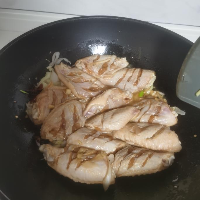 腌好后锅里加一点点油 因为鸡翅上的鸡皮很油,不要加太多 把前面的其他料倒下去炒一下 然后下入鸡翅