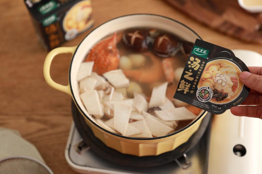 接着在锅底里放入太太乐汤之鲜佛跳墙味汤底调味料3包,搅拌均匀。 汤底调味料选择多种食材充分混合升温熬煮超过半个小时,可替代高汤底,做这道海鲜锅的锅底实在是太适合不过了。 16克的独立包装,还可以根据自己家的饮食习惯煮汤,炖菜,熬粥都可。