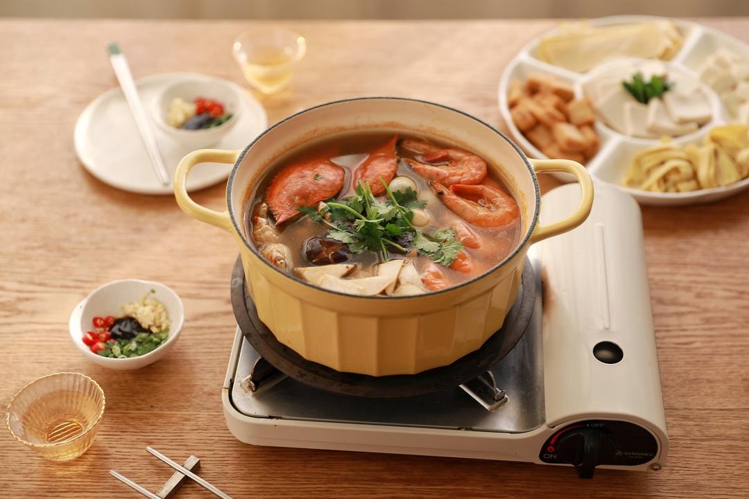 海鲜锅底准备完毕,我还准备了些豆制品拼盘,有豆腐,豆泡,油豆皮,干豆腐和千页豆腐,腐竹可以随时涮着吃。