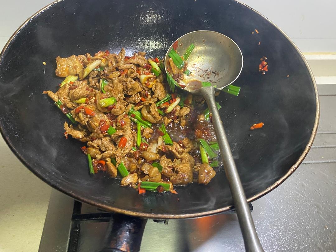 加入辣椒和瘦肉,炒至瘦肉变色成熟。