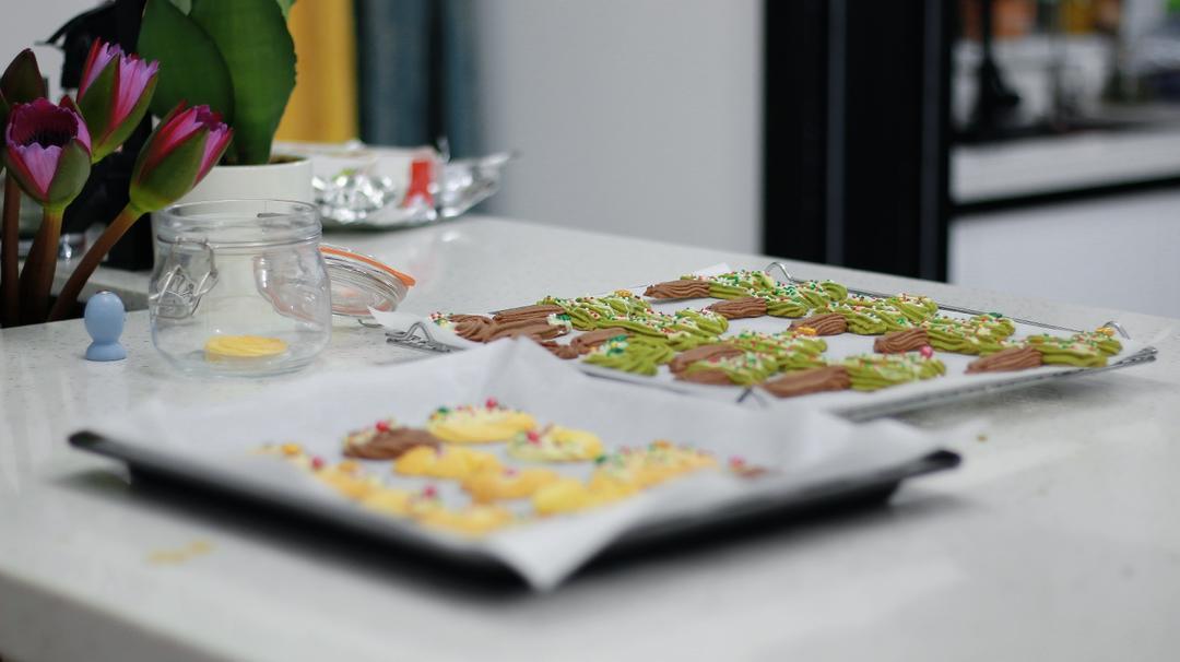tips:挤花过程如果觉得费力,可能是黄油软化或者打发不到位,室温太低也会不好挤,冬天建议开20多度暖气操作。 裱花嘴随喜欢选择,小号也行,造型比较小巧,挤花时候裱花嘴始终垂直于油纸哦~