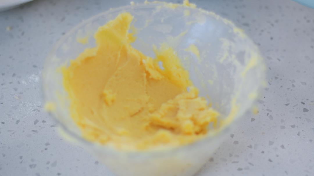 黄油用刮刀抹开加入糖、盐拌匀