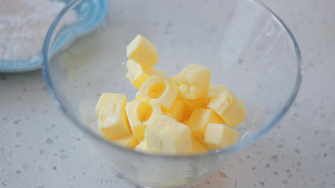 1. 黄油切小块室温软化或者烤箱有发酵功能的 40度左右软化十来分钟,至手指可轻松戳洞即可