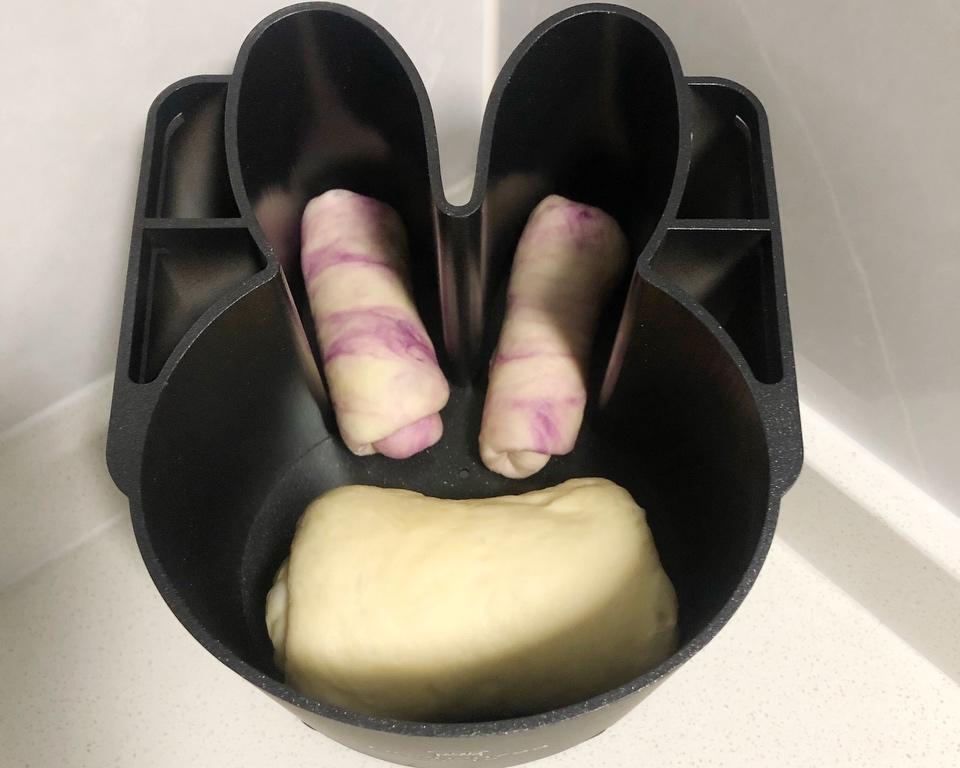 除去黄油和盐,其他材料放入桶内,打到八成筋度之后加入这两样,揉出手套膜。 打好的面团称重,分出180克,加入紫薯粉揉进去,不用完全揉匀