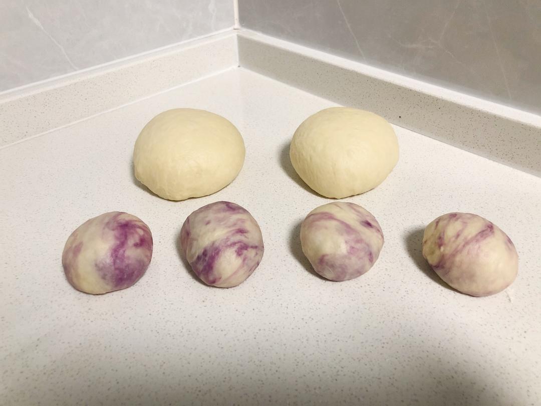 发酵好的面团排气称重,白面团均分成2份,紫面团均分成4份,盖上保鲜膜松弛20分钟