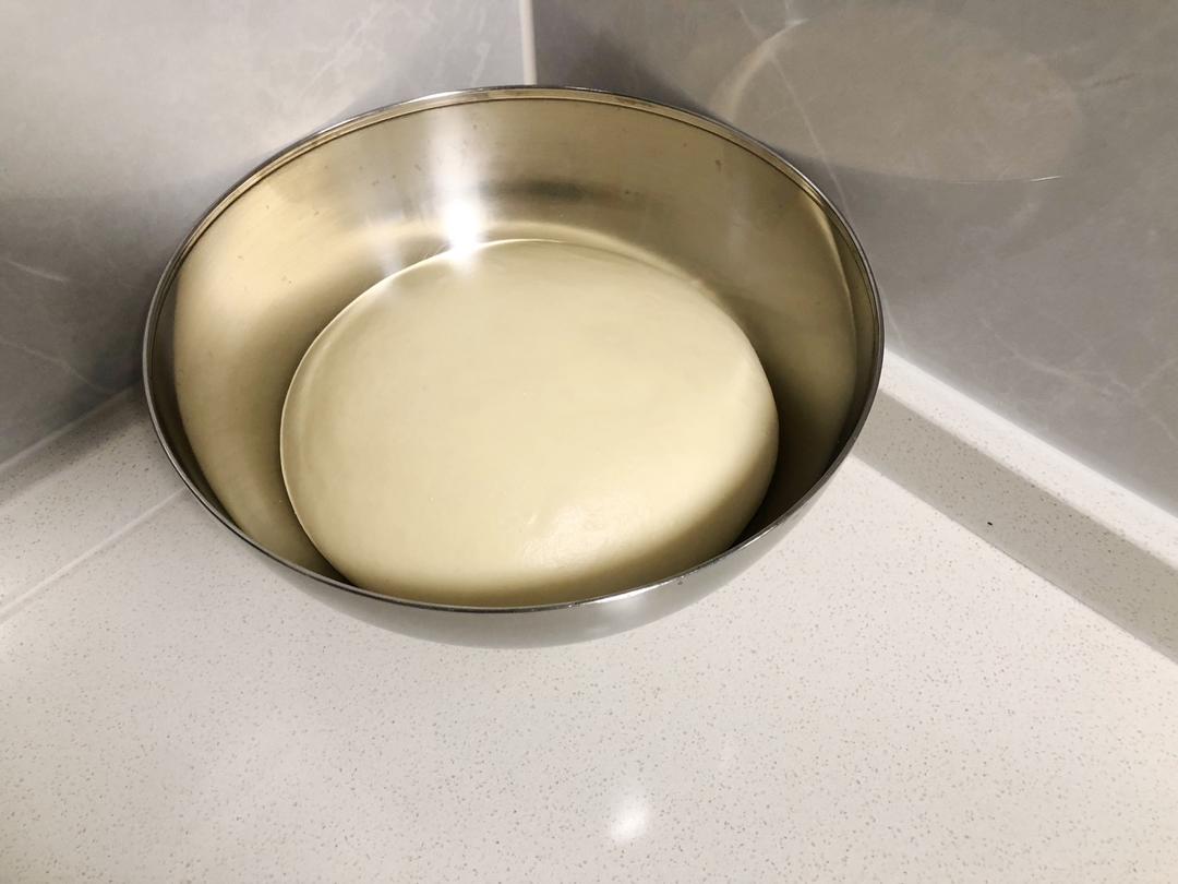 面团放入碗内,盖上保鲜膜,温度28摄氏度,湿地75,发酵80分钟,以最终状态为准,大小要1.5倍大才可以。 (上图为发酵好的)