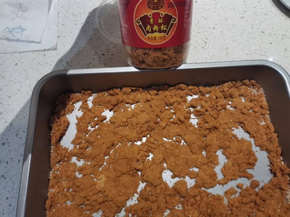 肉松,白芝麻要铺在盘子底下哦,然后把锅中的那一坨未成形的雪花酥倒入盘子里,可以用擀面杖压平,最后在表面洒入芝麻,肉松。