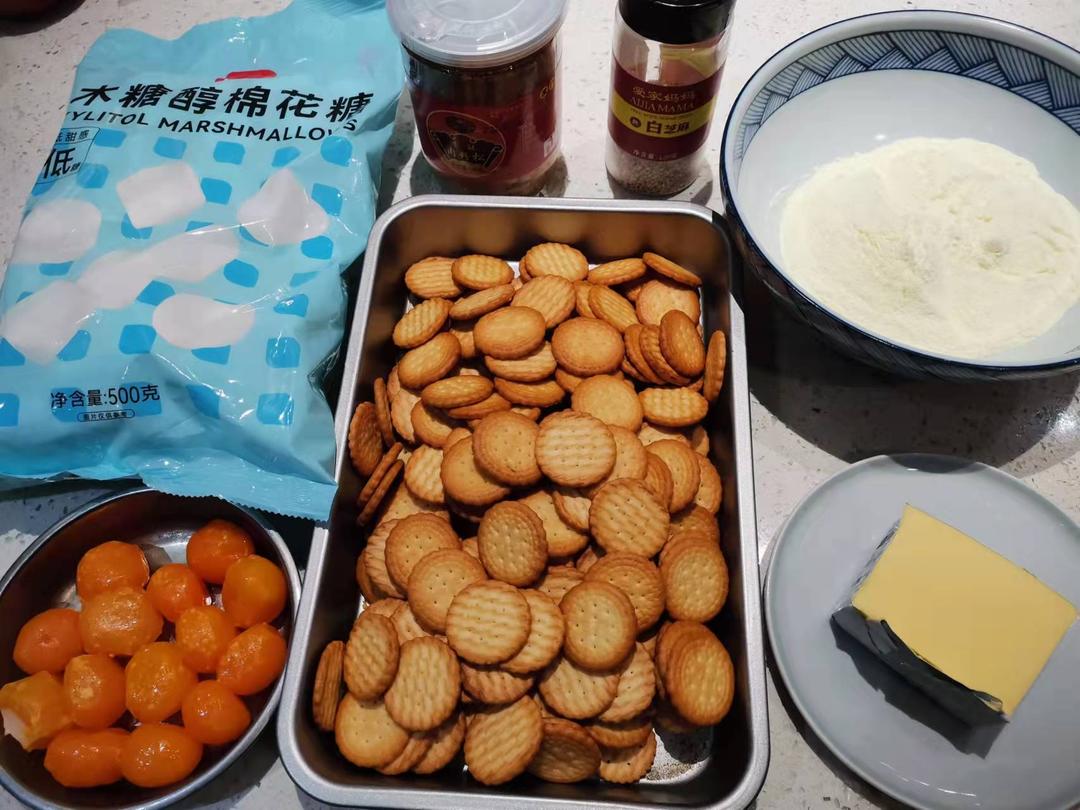 准备好各种食材,一蹴而就 🌻棉花糖买的是展艺的低糖版,负罪感没那么强烈😂 🌿黄油买的是新西兰进口的恩蓓可淡味黄油,这款黄油性价比相对高,且做雪花酥对黄油要求没那么高,所以没买安佳的黄油,当然土豪也可以买安佳的黄油哦(ー_ー)!! 🌴咸蛋黄是在烘焙店买的,有专门的熟的咸蛋黄卖,不需要去市场买咸蛋再挑咸蛋黄那么麻烦哦😛 🌺肉松,小圆饼是在朴朴买的,刚好有特价。作为一个少妇,时刻关注着哪里有羊毛薅🤓 🎍奶粉随意,什么牌子都行~婴幼儿的也行,就是贵了点😊 🐔咸蛋黄的准备,需要放一盖料酒先蒸15—20分钟,这样是为了去咸蛋黄腥味,而且加热一下更好碾压。要记得把咸蛋黄尽量压碎,try your best🤣