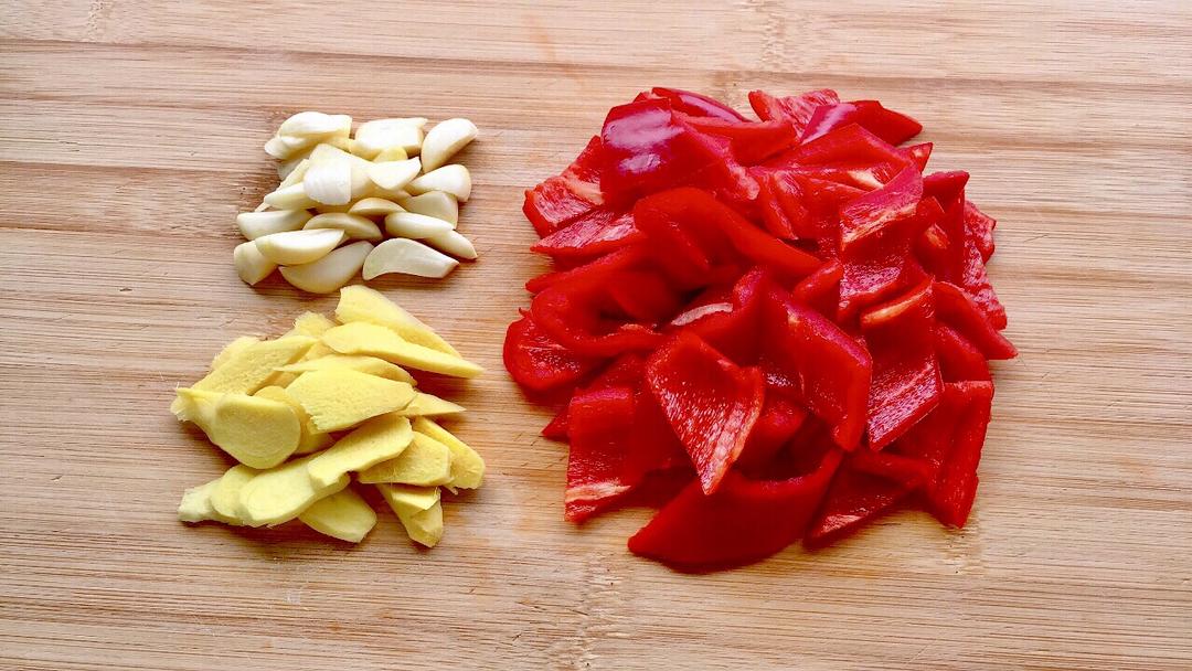 4、接下来把老姜和大蒜去皮后切成片,红椒去籽切成块备用。