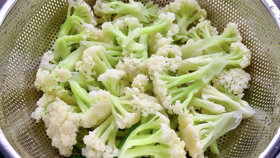 1、先将整颗花菜花朵朝下放入淡盐水中浸泡15分钟,洗净后再用手掰成小朵。