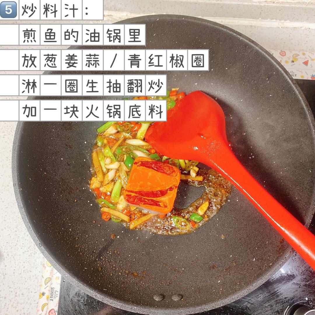 ❸调料汁:煎鱼的油锅放葱姜蒜/青红椒圈翻炒,淋一圈生抽、放一块火锅底料