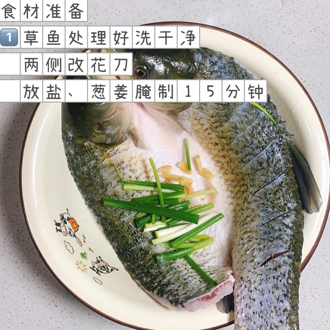 食材准备 ❶草鱼1条,请鱼老板帮忙处理一下~洗净改花刀用盐/葱姜腌制15分钟