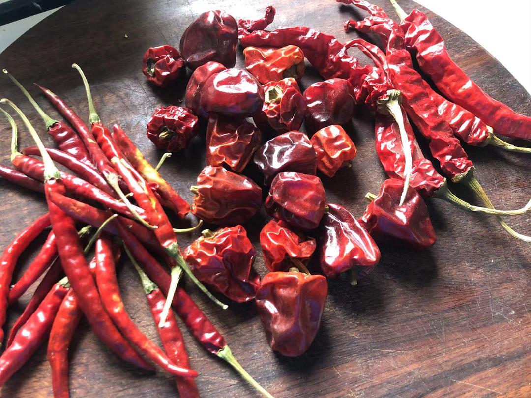准备三种配好比例的辣椒,选用多种辣椒的目的是充分发挥各种辣椒的特点:小米辣干辣椒——提供辣味;灯笼椒——香味十足;云南皱皮辣椒——辣味颜色俱全。