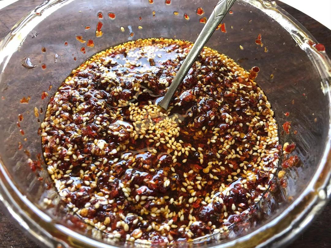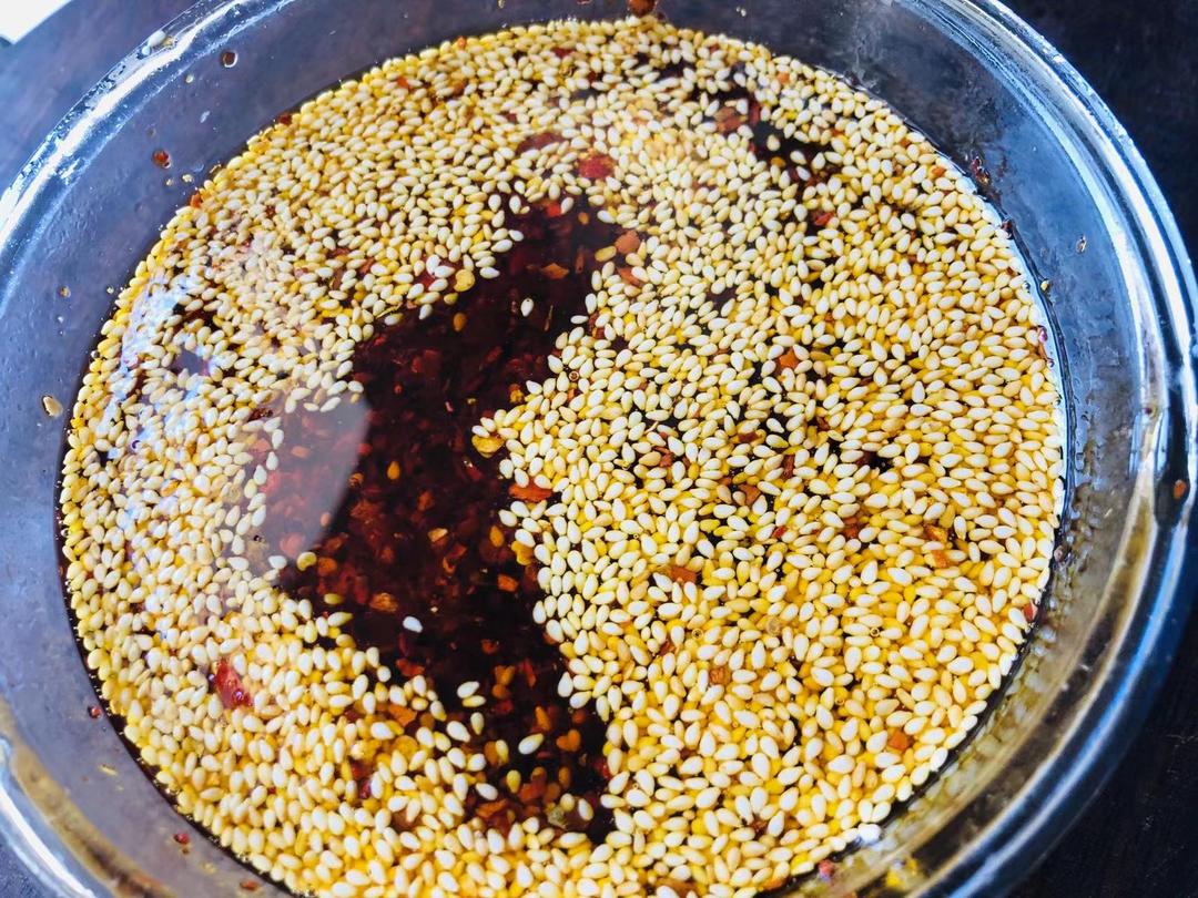 在磨好的辣椒面中加入炒好的白芝麻,淋上7成油温的热油两大勺(约200毫升),然后立即用勺子不停地搅拌防止炸糊。