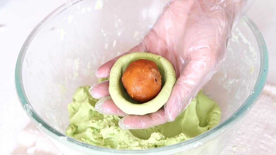 青团皮分成45g一个,放入冻硬的蛋黄肉松馅,包好