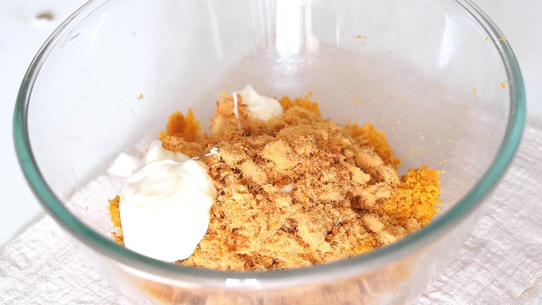 压碎的蛋黄里放入肉松,沙拉酱,糖,抓均匀