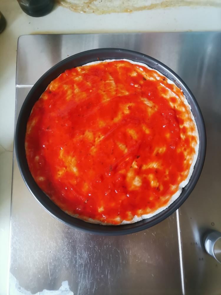 按成饼,34度发酵40分钟~1小时,看看稍微变大就可以,用叉子表面戳孔,这步忘记拍了。表面抹番茄酱