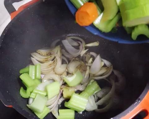 锅里加橄榄油(也可用芝麻油/菜籽油这一类优质的烹饪油)锅热后,把切好的洋葱、蒜片、姜片一起炒。爆香。 炒1-2分钟。微微上色,有香味即可。不需要炒很久,炒过头会影响汤色和味道。 转移到煲汤锅。