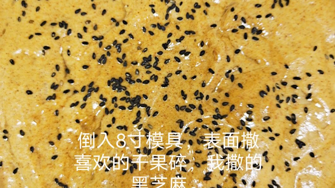 倒入8寸磨具,九分满,表面撒喜欢的干果碎就可以了。我撒的芝麻。进烤箱,160度预热后,烤一个小时。