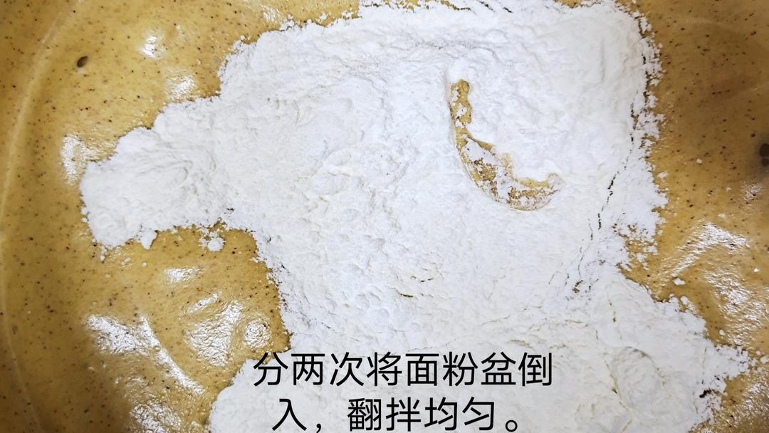 分两次把粉盆导入打发好的蛋盆里,翻拌均匀。