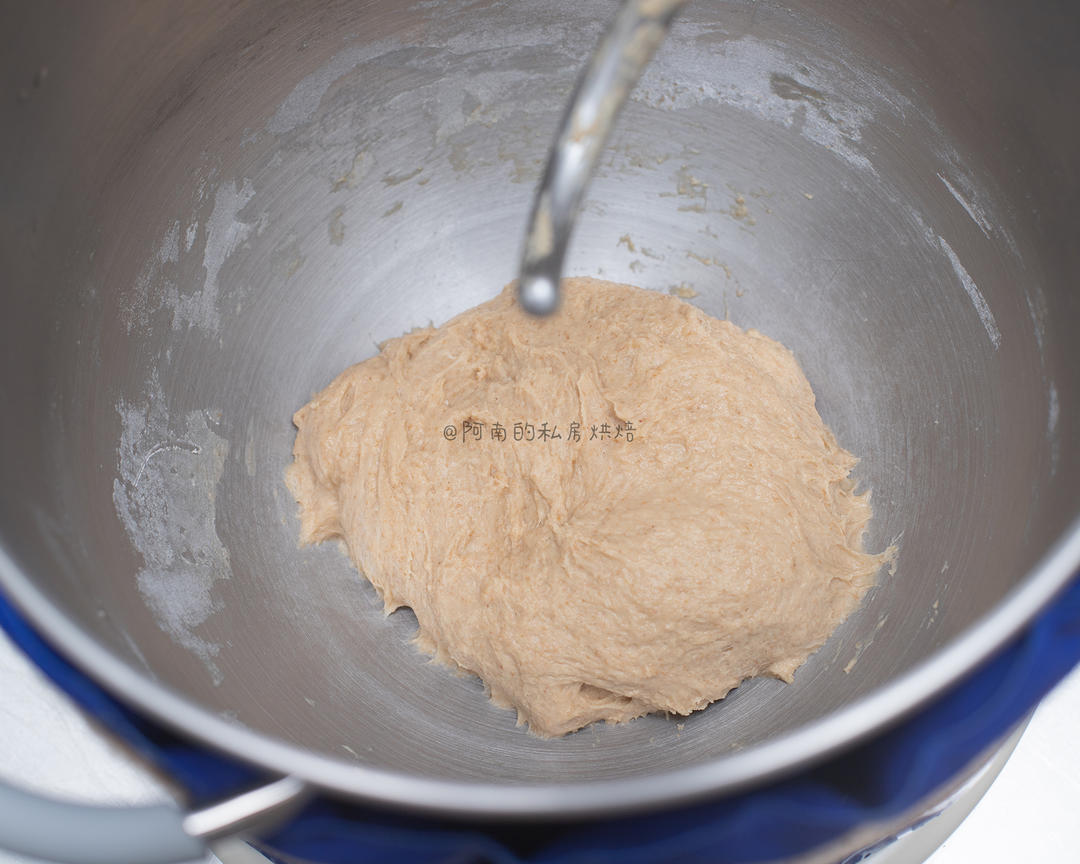 缸中倒入面团材料(除黄油以外)开启1挡慢速混合均匀后开启中高速揉面