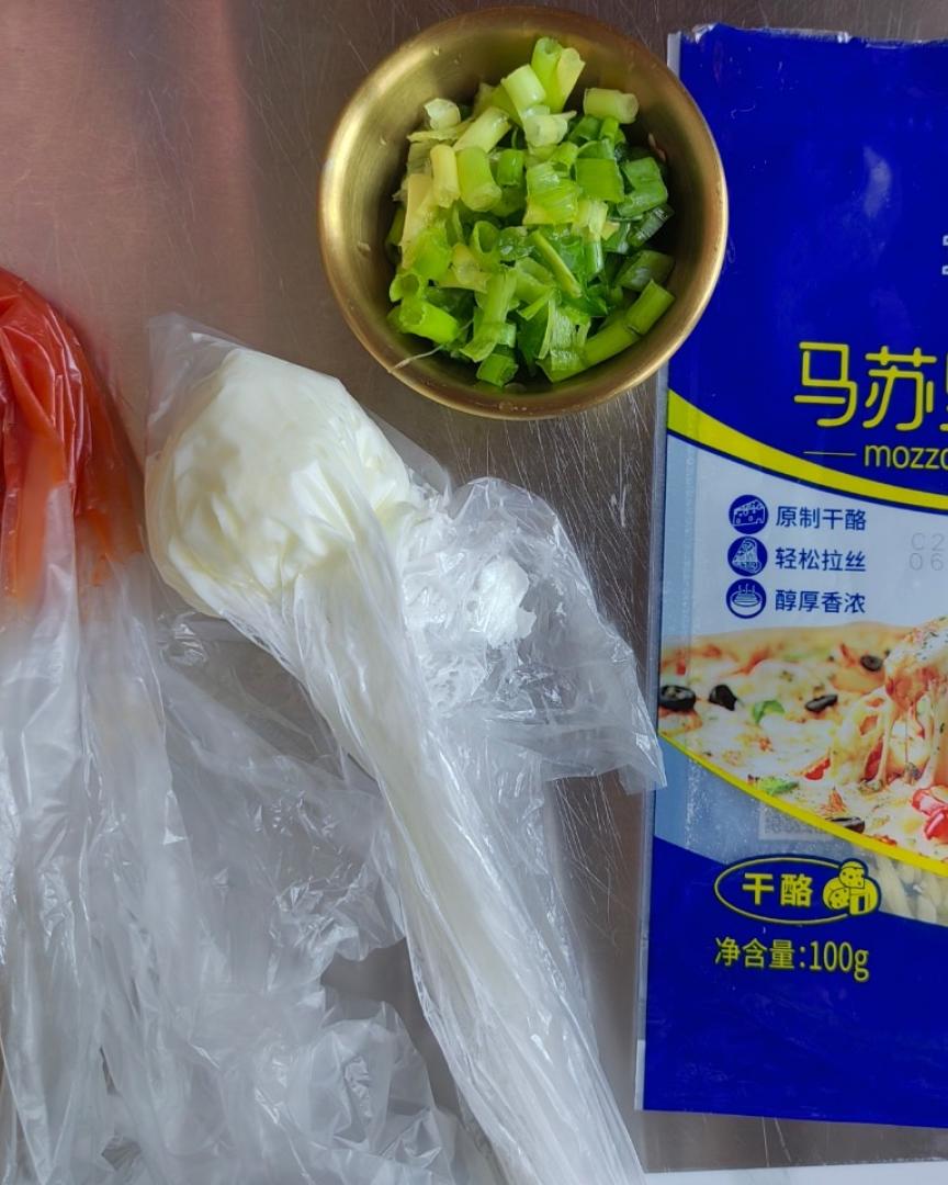 准备好葱花、鸡蛋、马苏里拉奶酪芝士、番茄酱和沙拉酱装进裱花袋里,没有裱花袋就跟我一样装进一个干净的食品袋里