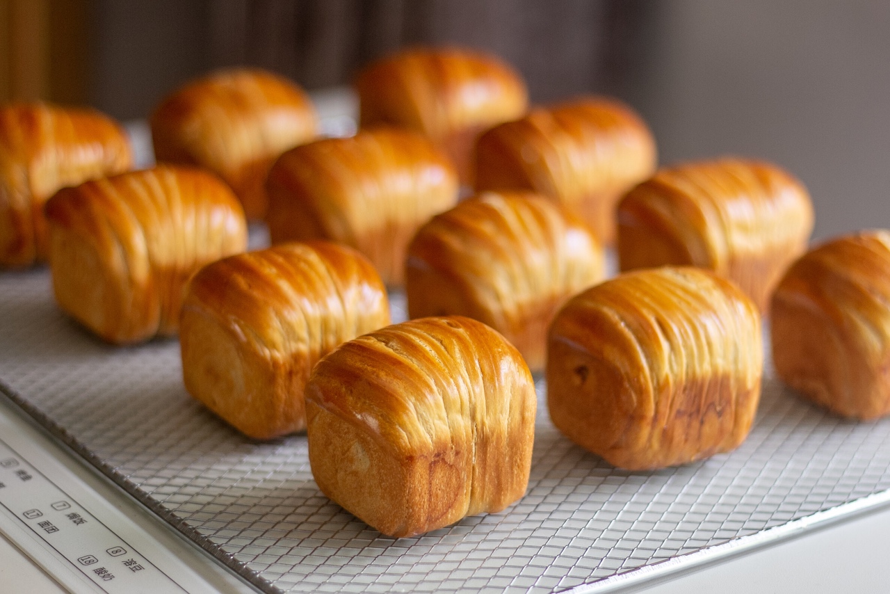 送入预热好的平炉155/200度烘烤23分钟,出炉震出热气后脱模。