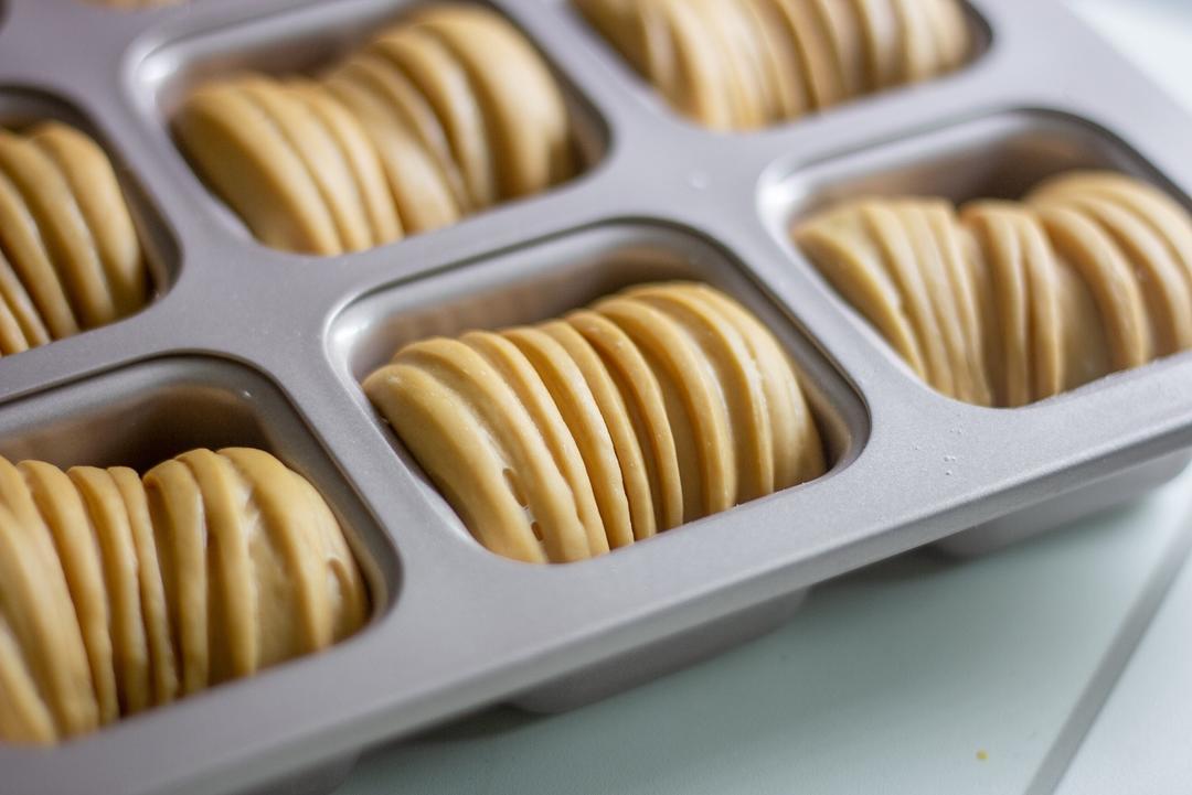 一个小时左右取出发酵好的面团按压排气,等分12份,滚圆后盖上保鲜膜松弛20分钟。如果做450克吐司不分割直接整形。